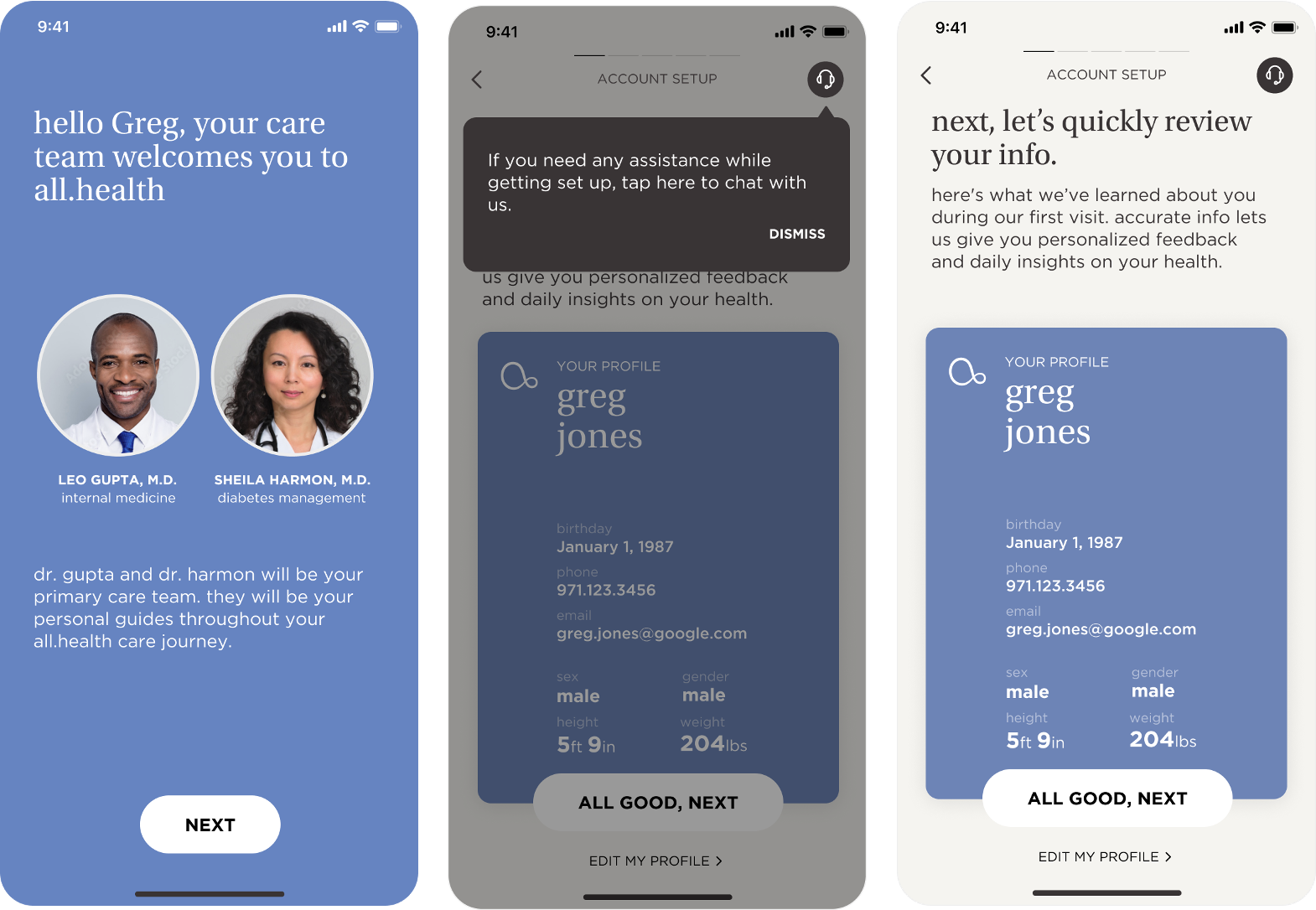 - If a clinician has been assigned to you, they will show here. If there isn’t a clinician listed, one will be assigned soon. Select Next to proceed.