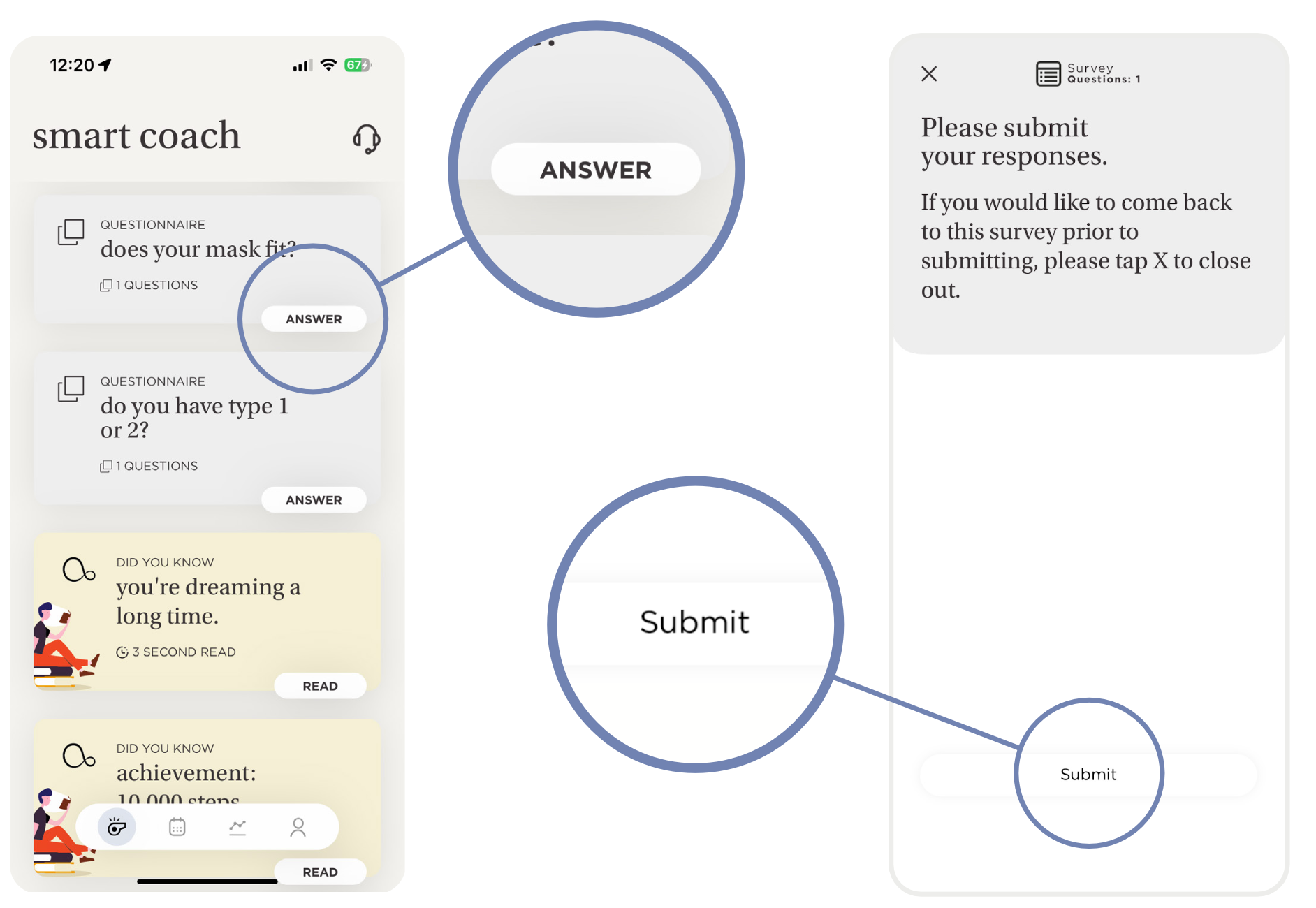 These are questionnaires that appear on your smart coach screen to tell us more about you to help your coach to help you with your care journey. Your answers will be available for your coach.