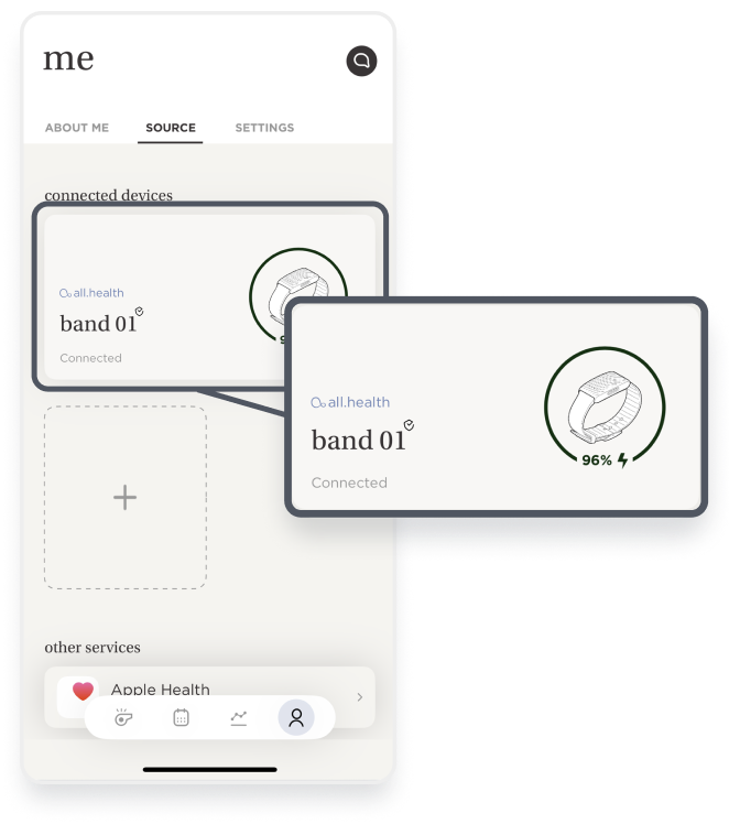 How To Know Your Band Is Connected August 19, 2024 11:24 In the all.health app, select the Profile icon on the bottom right.Select Source.An image of your band should appear with your current battery level and connection status.